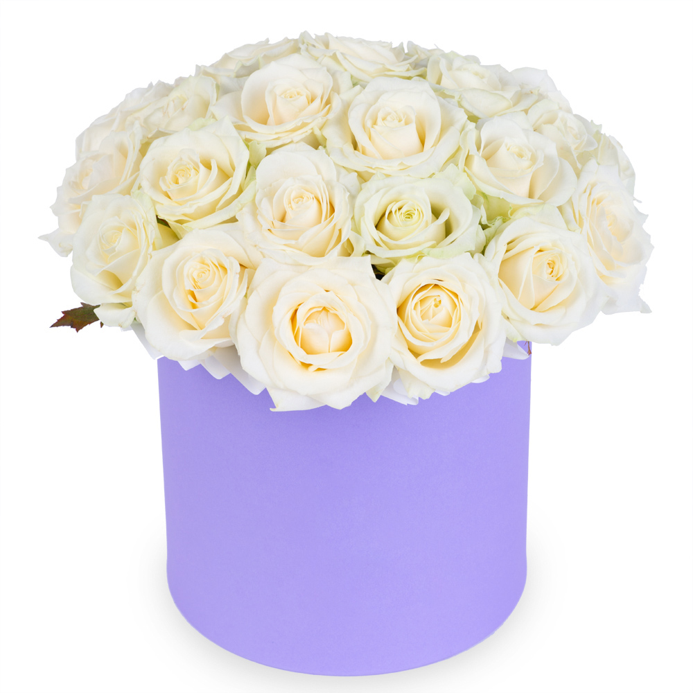 Букет из 25 белых роз premium в фиолетовой шляпной коробке