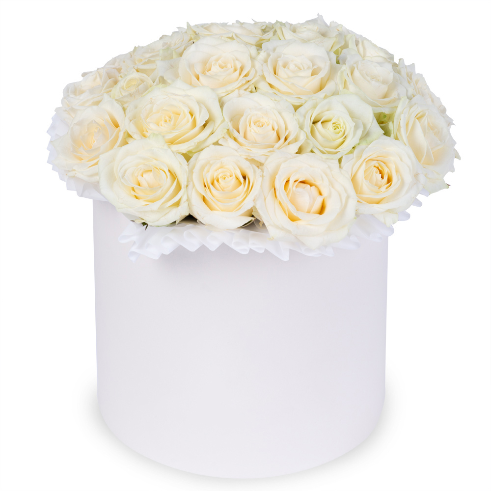 25 белых роз premium в кремовой шляпной коробке