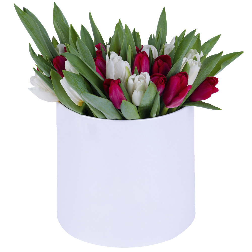 51 Разноцветный тюльпан в белой шляпной коробке