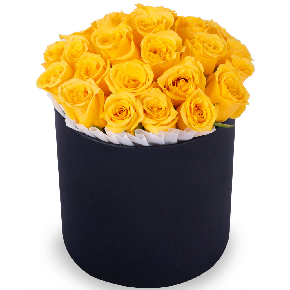 25 желтых роз в черной шляпной коробке