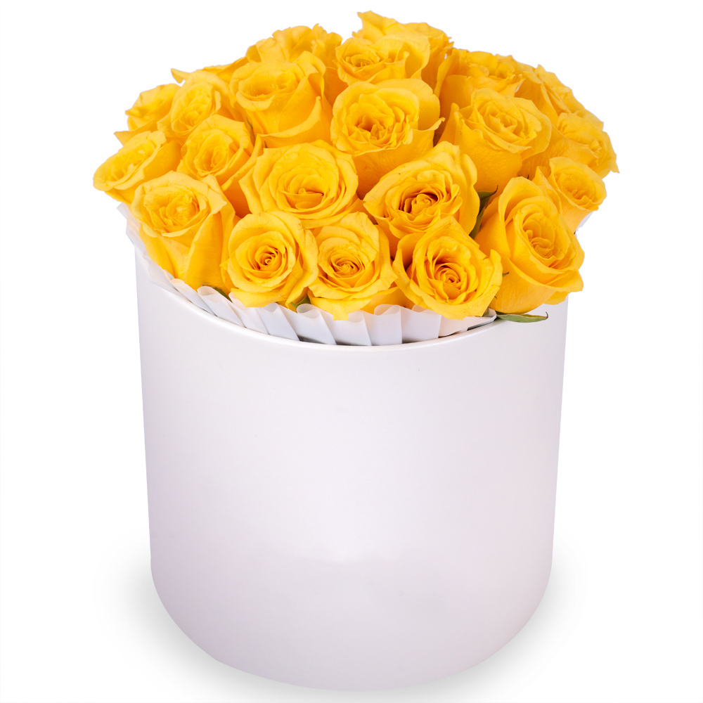 25 желтых роз в кремовой шляпной коробке