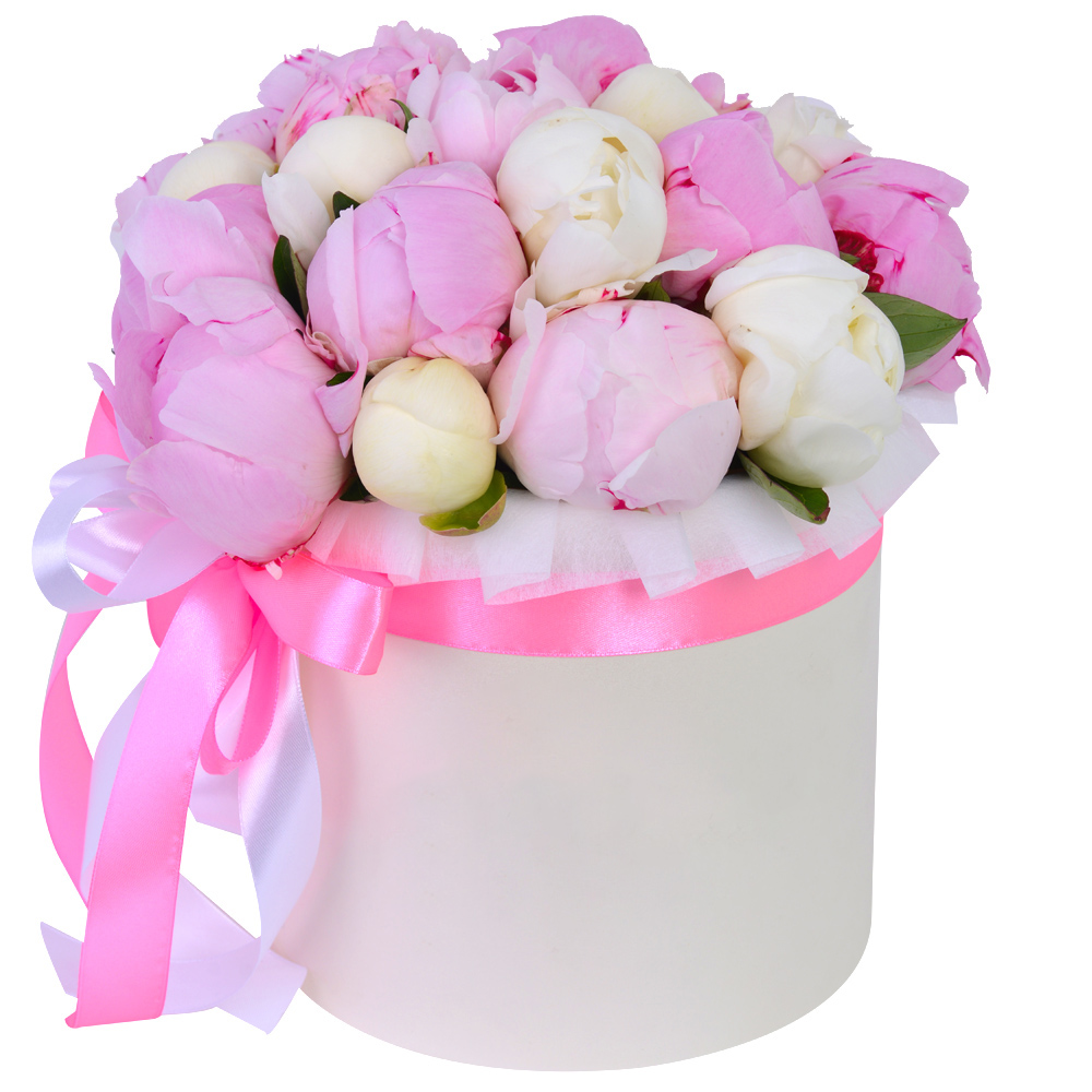 Букет из 19 разноцветных пионов в кремовой шляпной коробке
