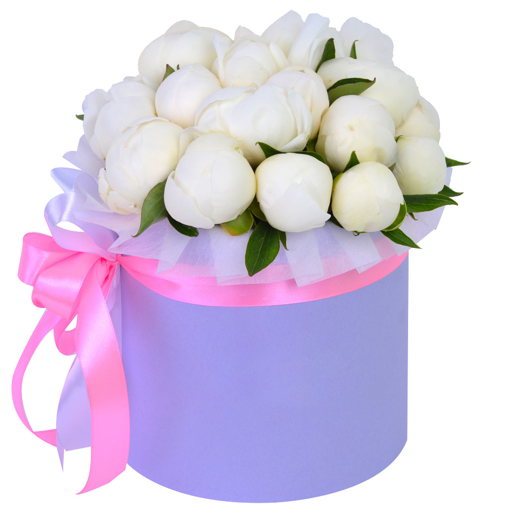 Букет из 19 белых пионов в фиолетовой шляпной коробке