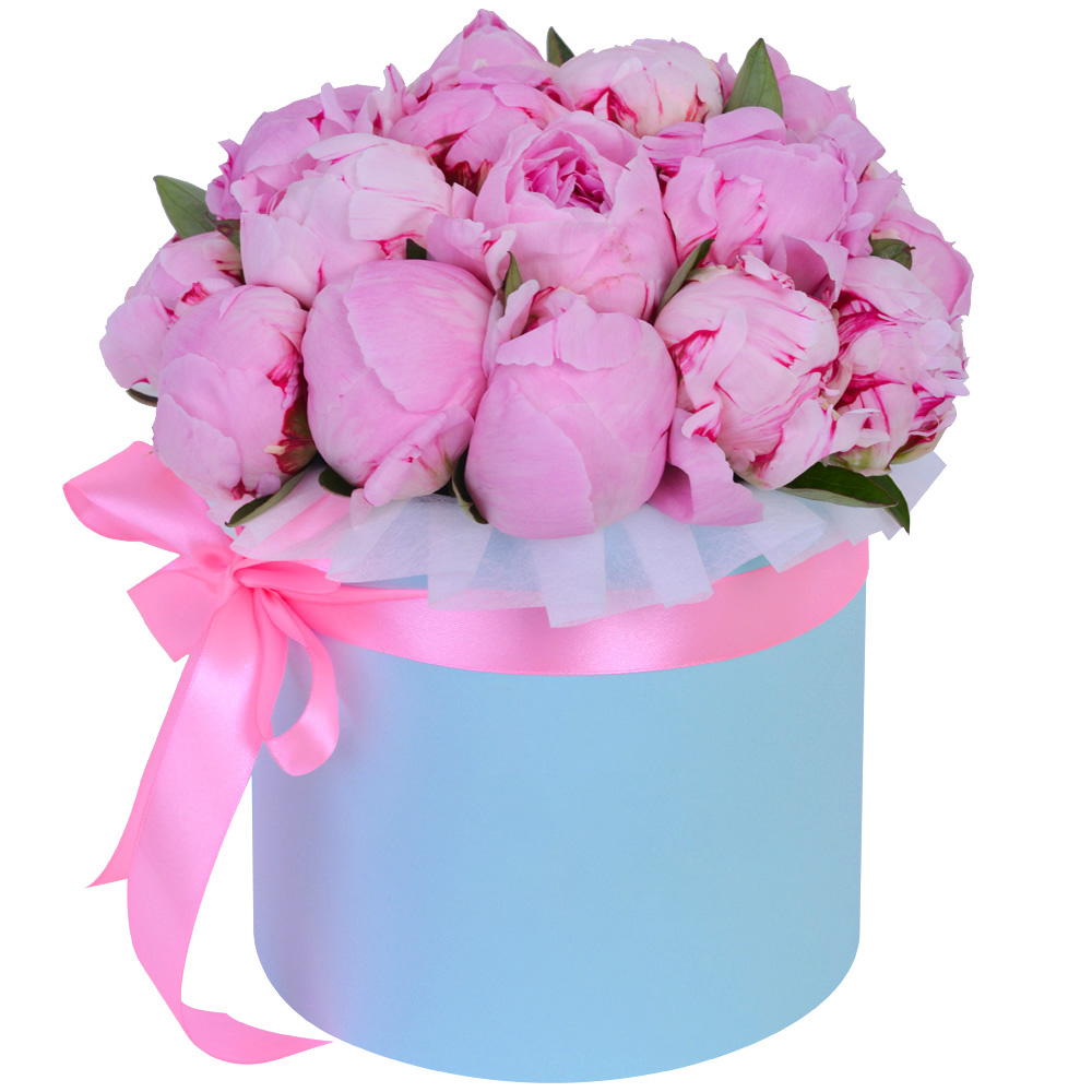 Букет из 21 розового пиона в голубой шляпной коробке