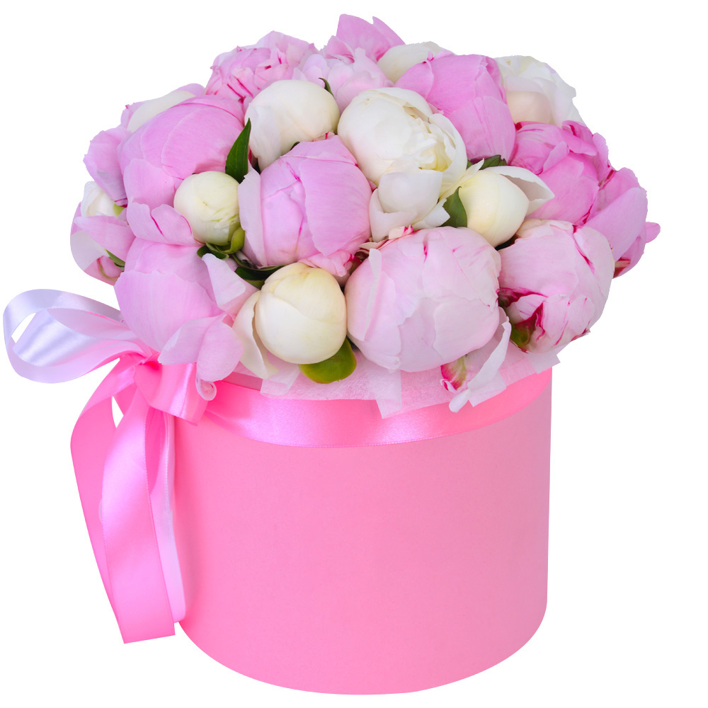 Букет из 25 разноцветных пионов в розовой шляпной коробке