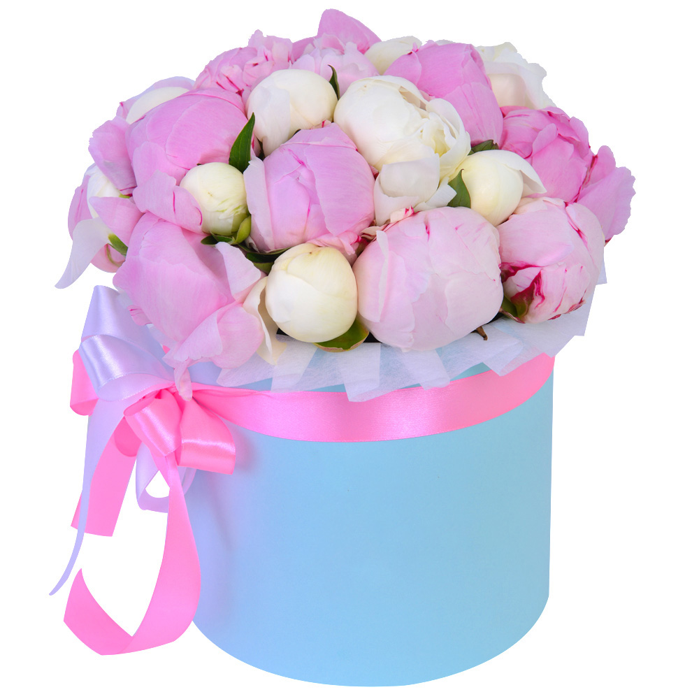 Букет из 25 разноцветных пионов в голубой шляпной коробке