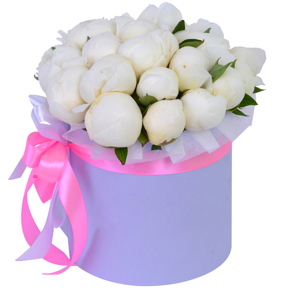 Букет из 25 белых пионов в фиолетовой шляпной коробке
