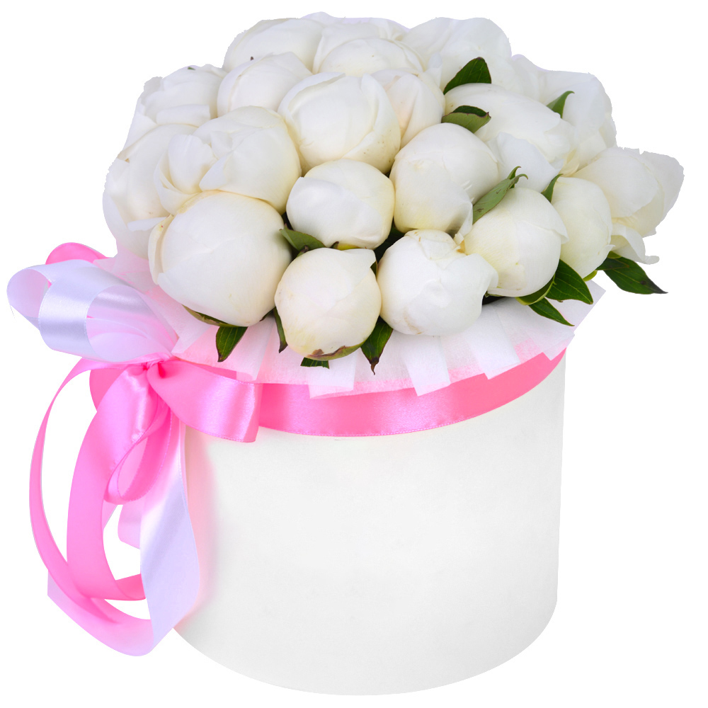 Букет из 25 белых пионов в белой шляпной коробке