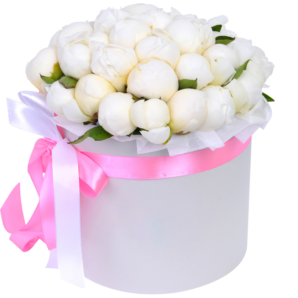 Букет из 35 белых пионов в белой бархатной шляпной коробке