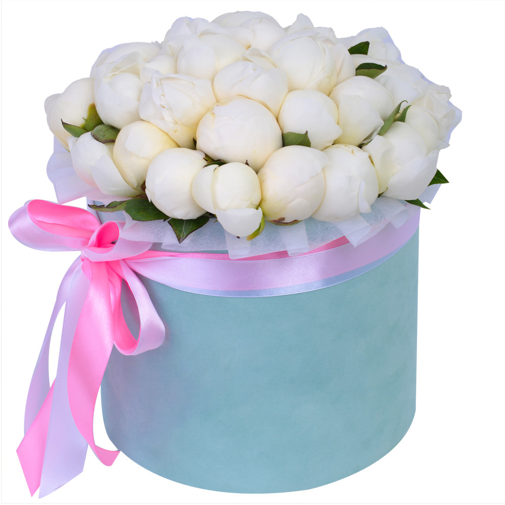 Букет из 35 белых пионов в зеленой бархатной шляпной коробке