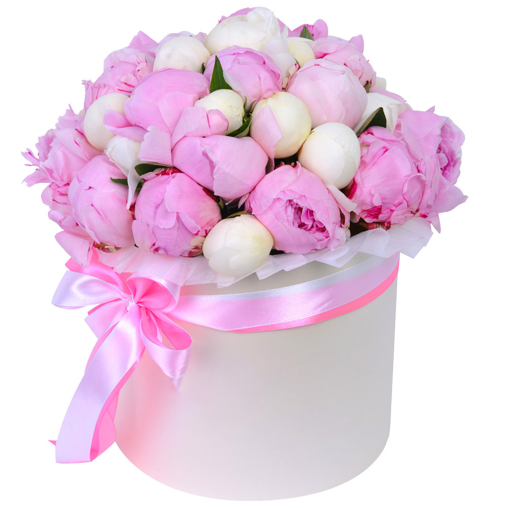 Букет из 35 разноцветных пионов в кремовой шляпной коробке