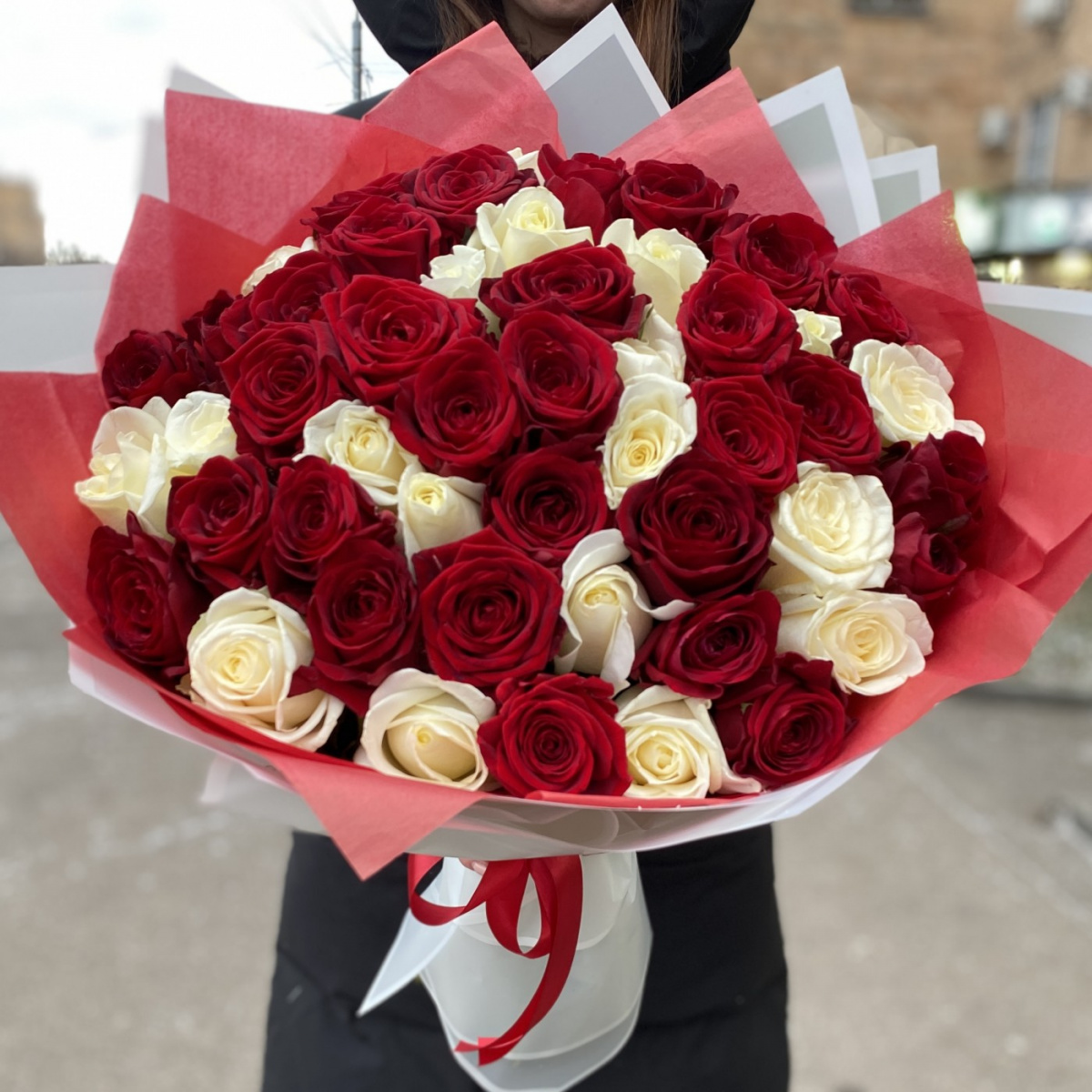 Букет из 51 красной и белой розы 50 см