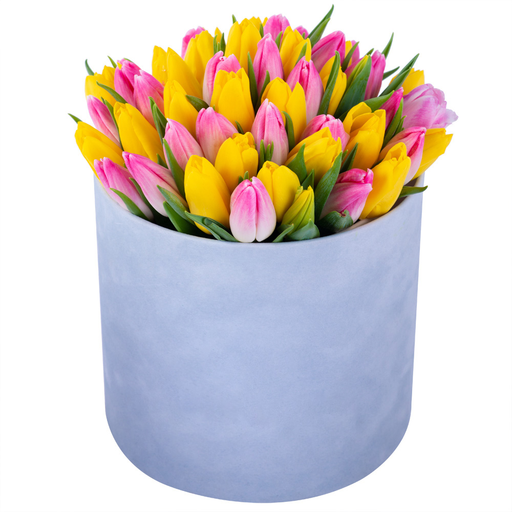 51 разноцветных тюльпан в серой бархатной шляпной коробке