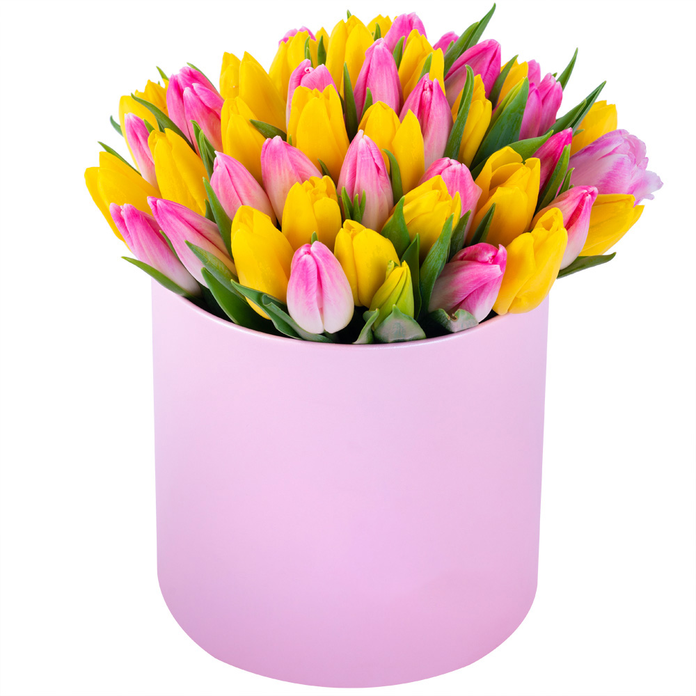 51 разноцветных тюльпан в розовой шляпной коробке
