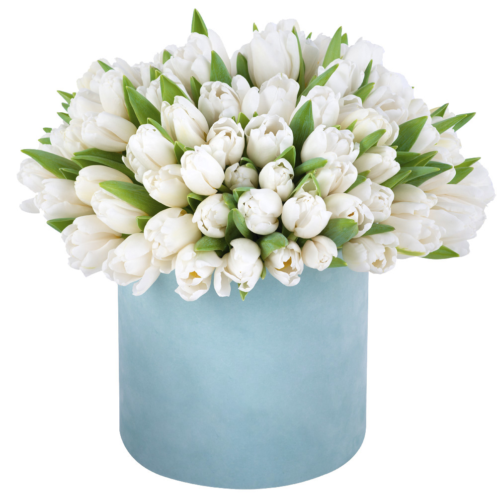 51 белый тюльпан в бархатной шляпной коробке