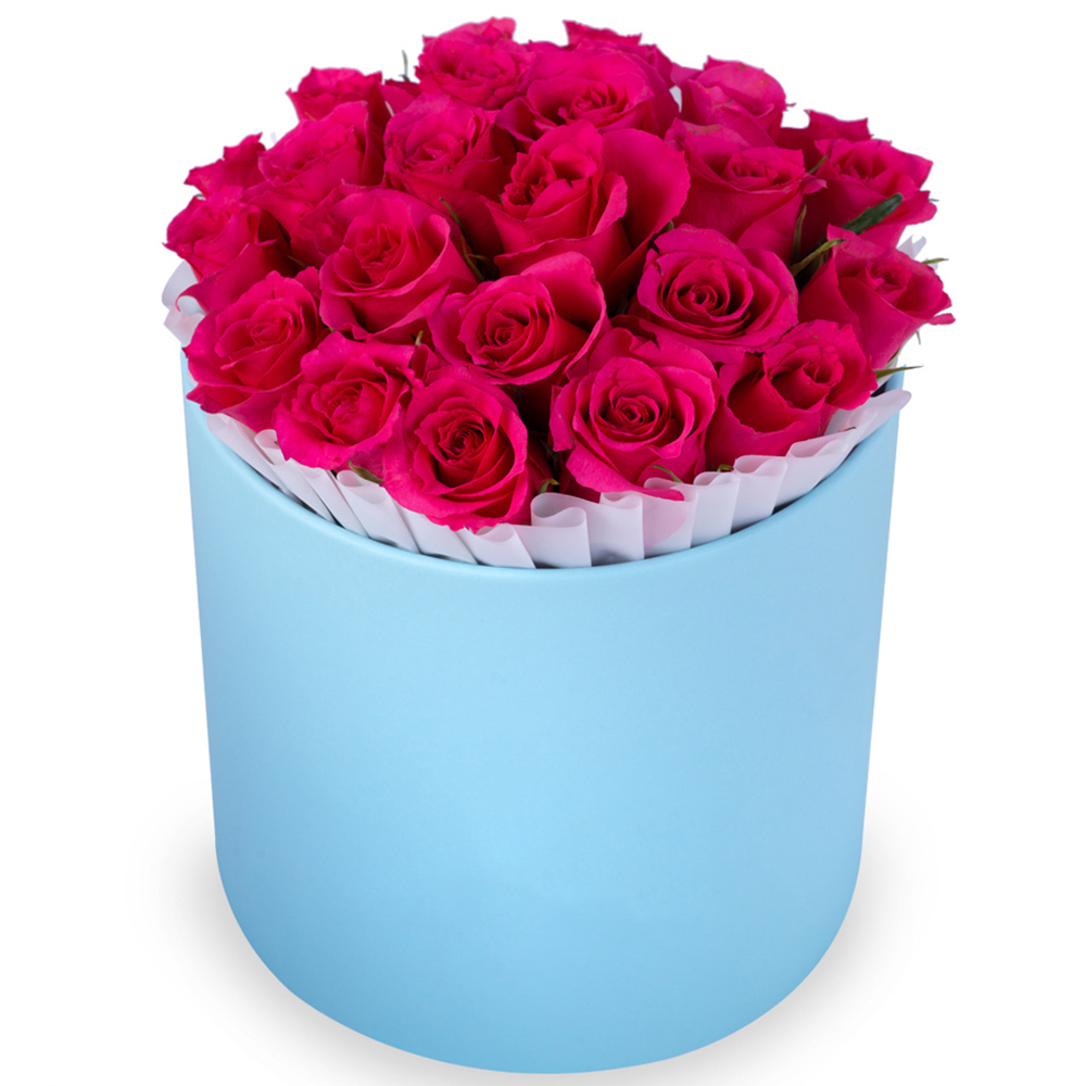 25 малиновых роз в голубой шляпной коробке