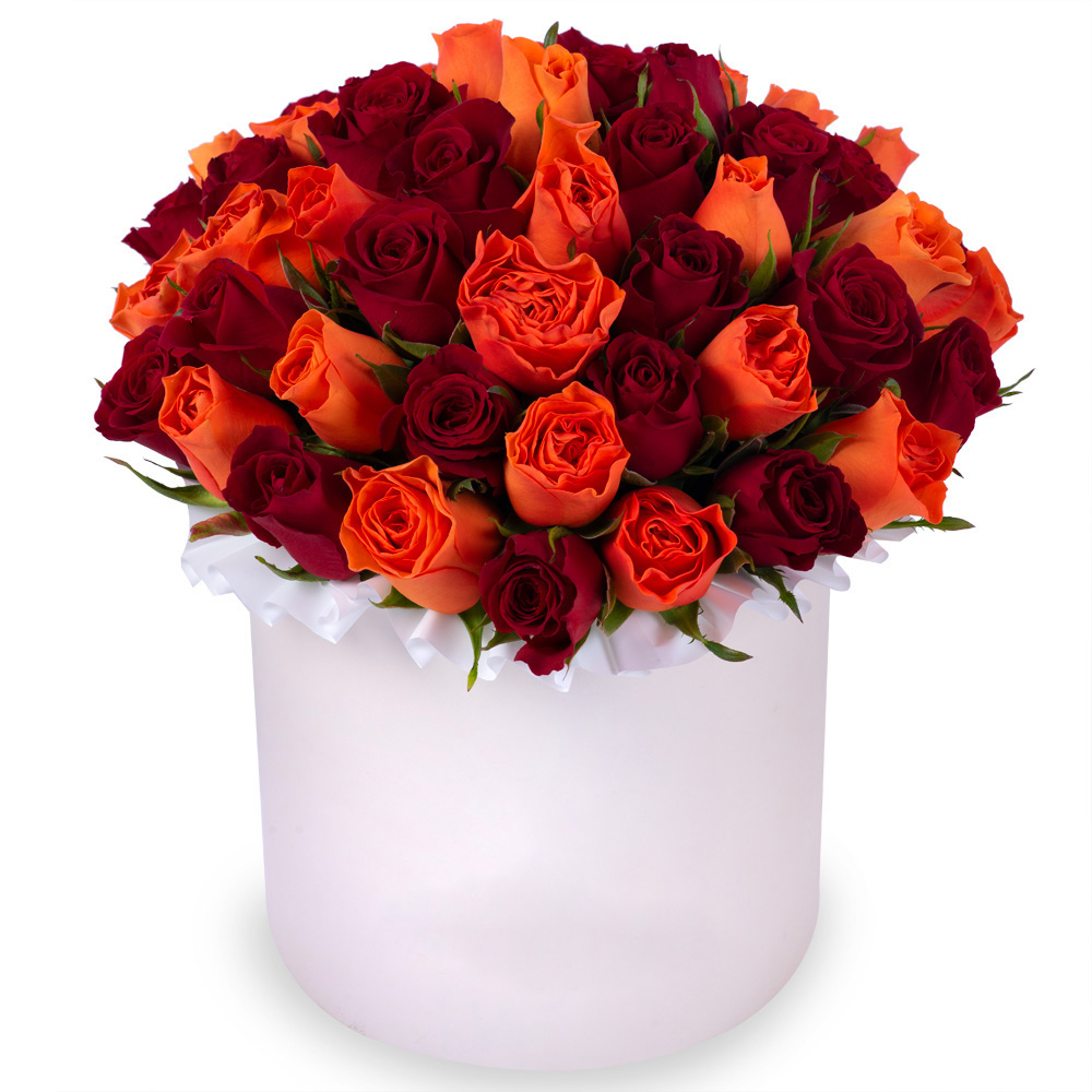 51 разноцветная роза в кремовой шляпной коробке