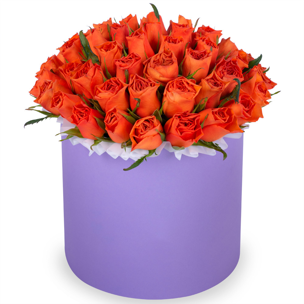 51 оранжевая роза в фиолетовой шляпной коробке