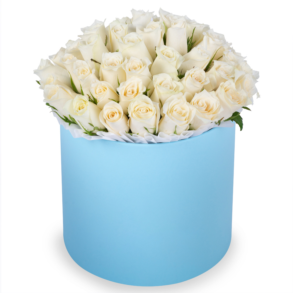 51 белая роза в голубой шляпной коробке