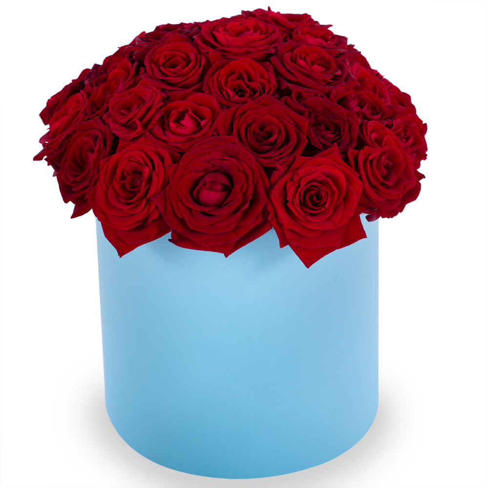 Букет из 35 красных роз premium в голубой шляпной коробке