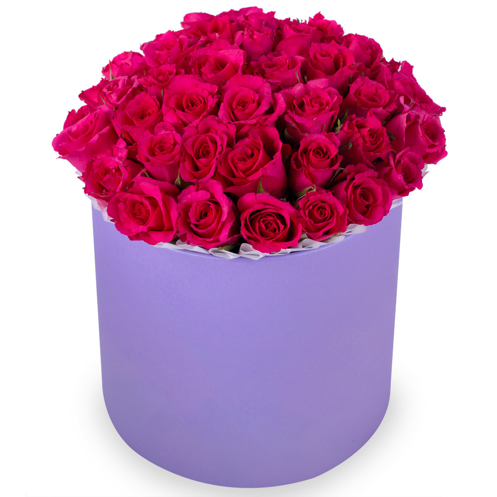 35 малиновых роз в фиолетовой шляпной коробке