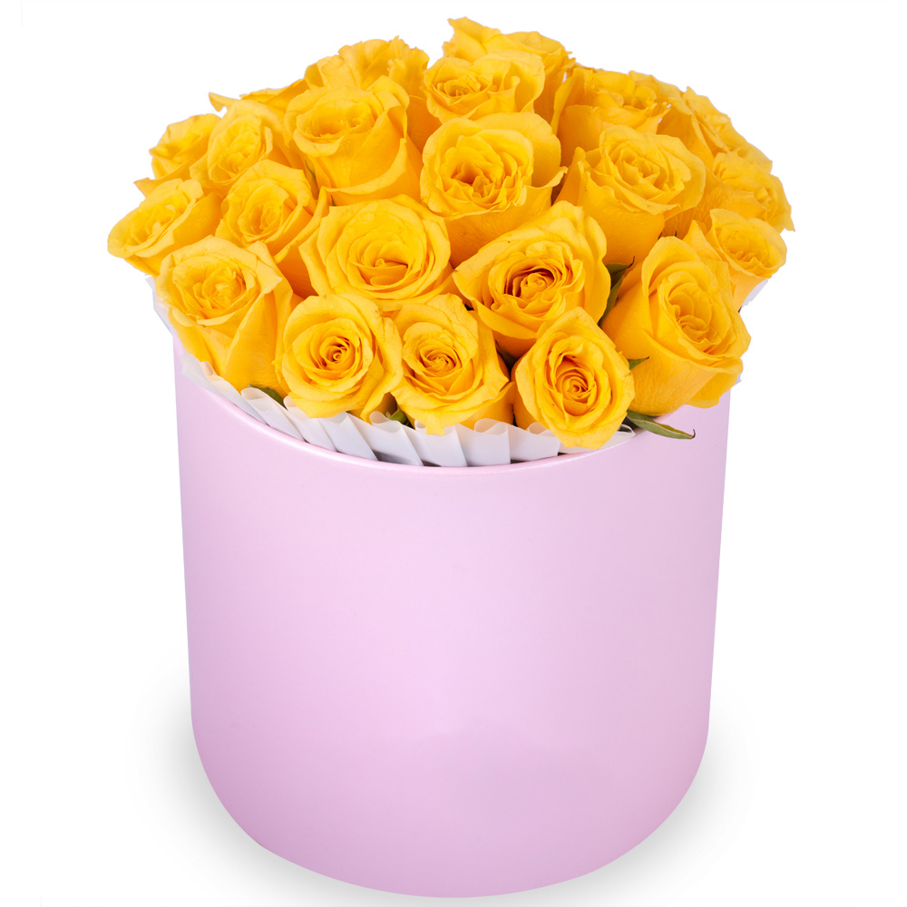 25 желтых роз в розовой шляпной коробке