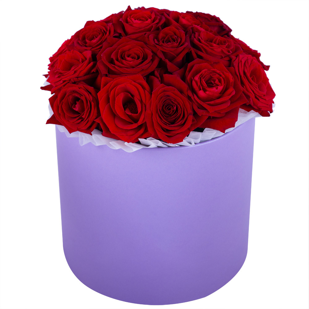 Букет из 19 красных роз premium в фиолетовой шляпной коробке