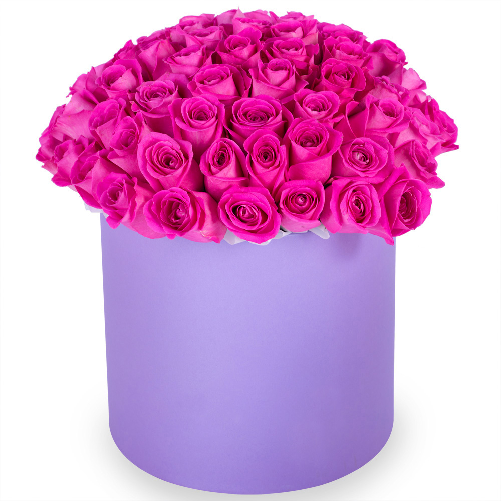 Букет из 75 розовых роз в фиолетовой шляпной коробке