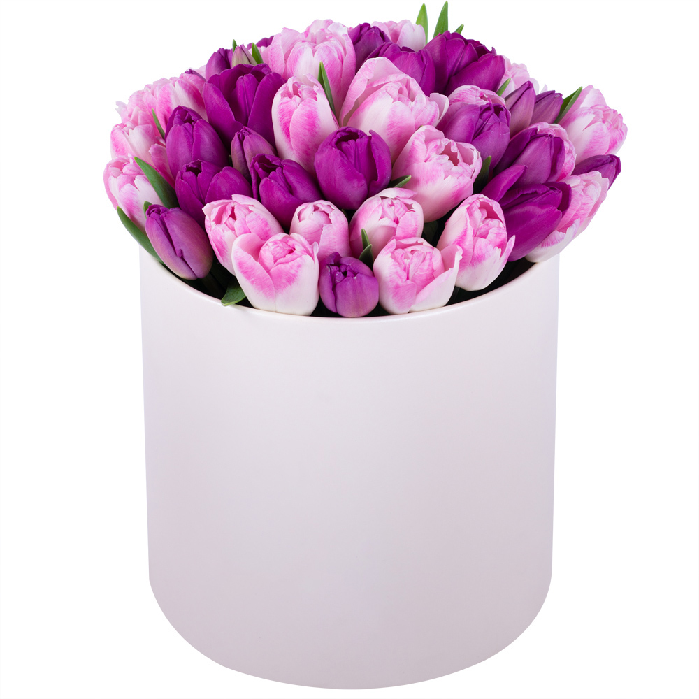 Разноцветный 51 тюльпан в шляпной кремовой коробке