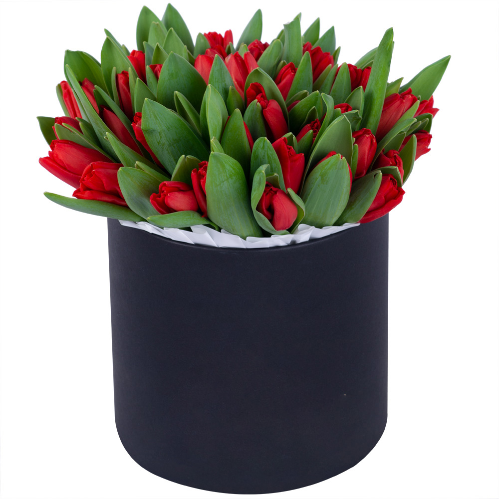 51 красный тюльпан в черной шляпной коробке