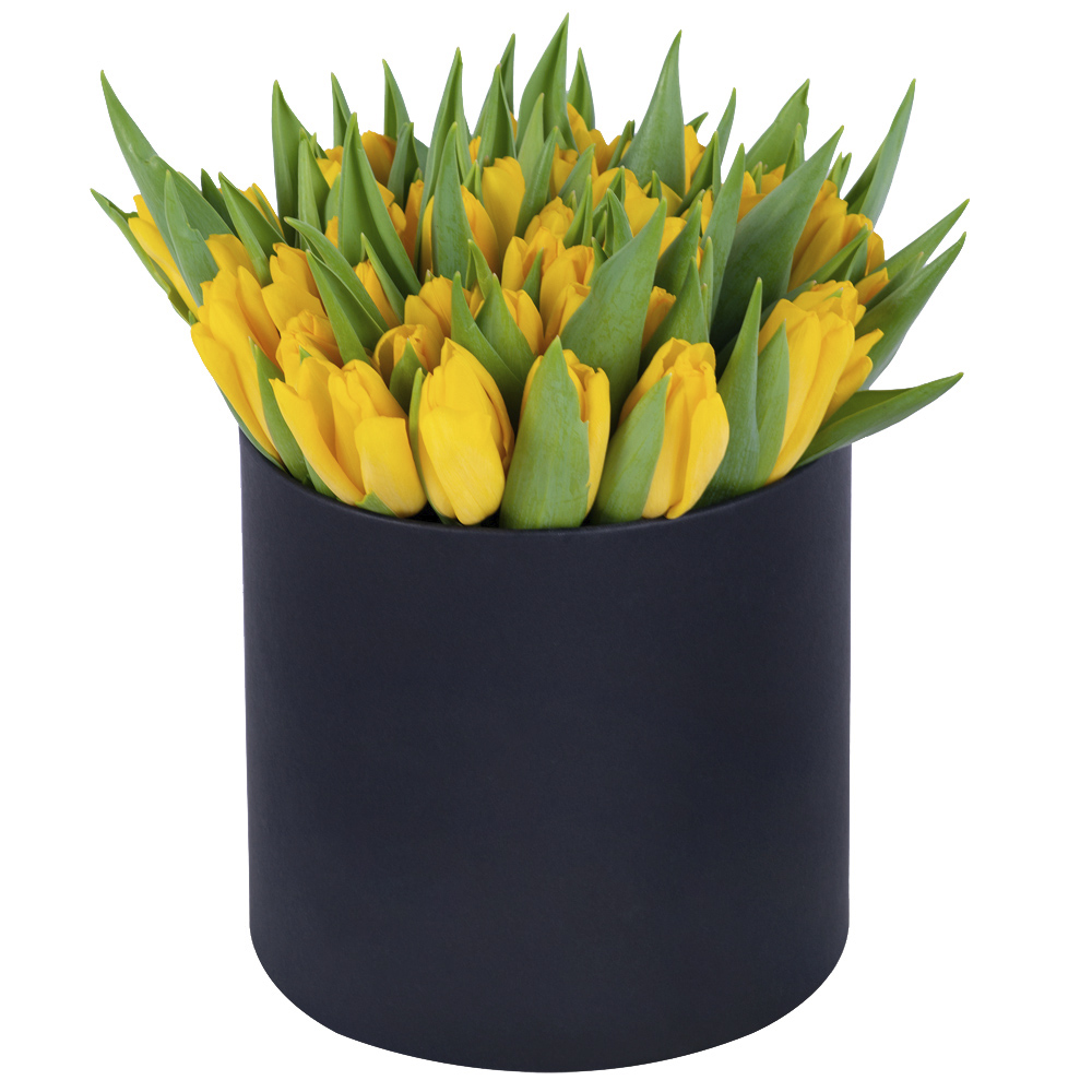 51 желтый тюльпан в черной шляпной коробке