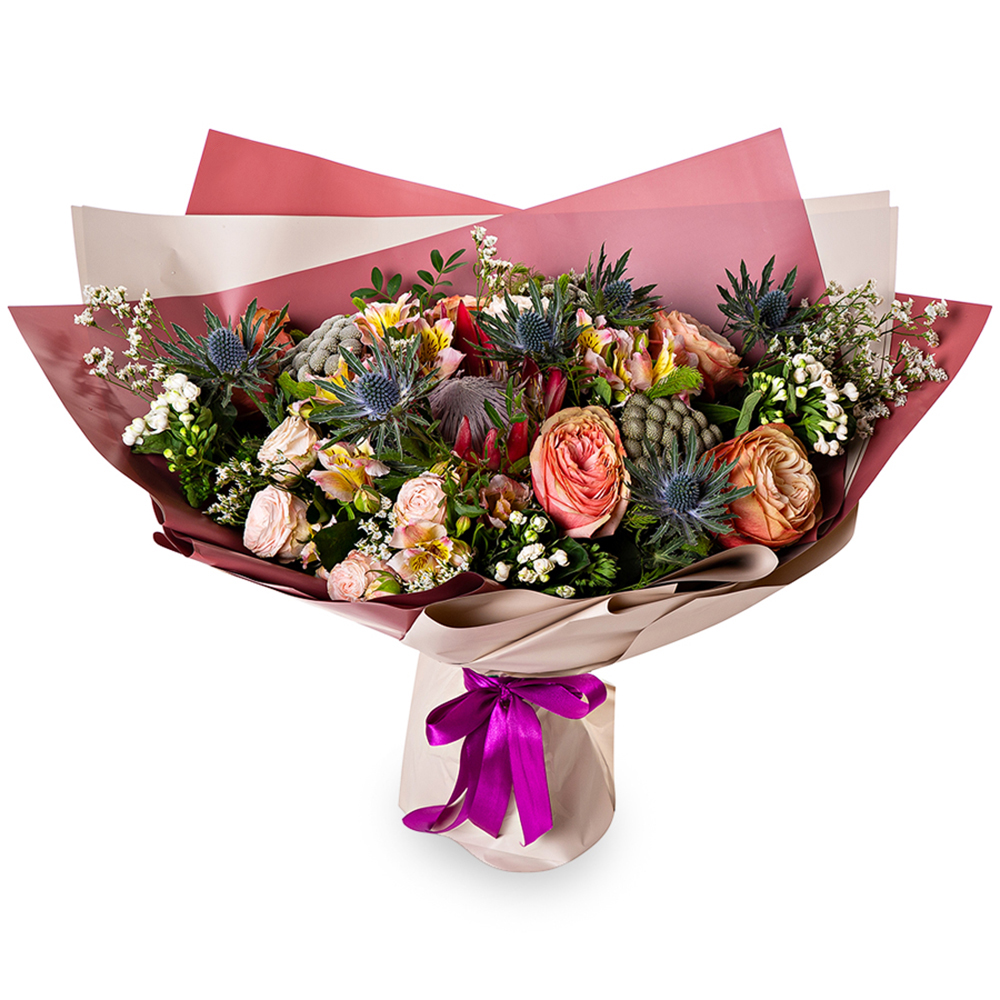 Букет с розами, протеей и брунией