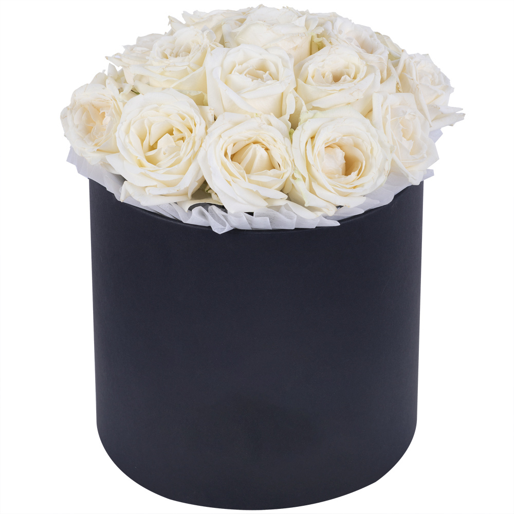 Букет из 19 белых роз premium в черной шляпной коробке