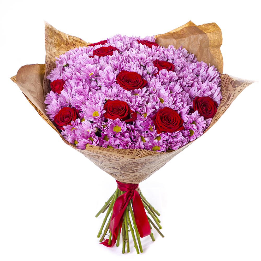 Букет из роз и сиреневых хризантем