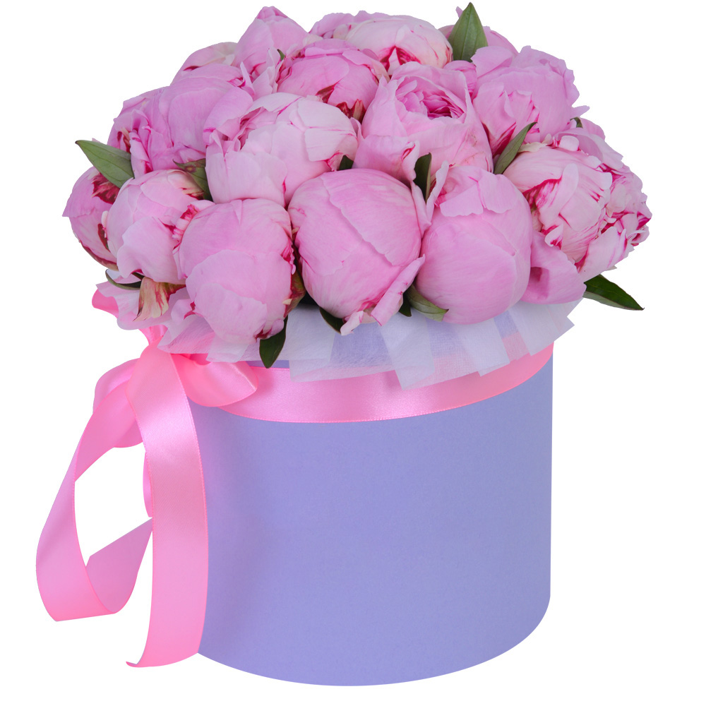 Букет из 21 розового пиона в фиолетовой шляпной коробке