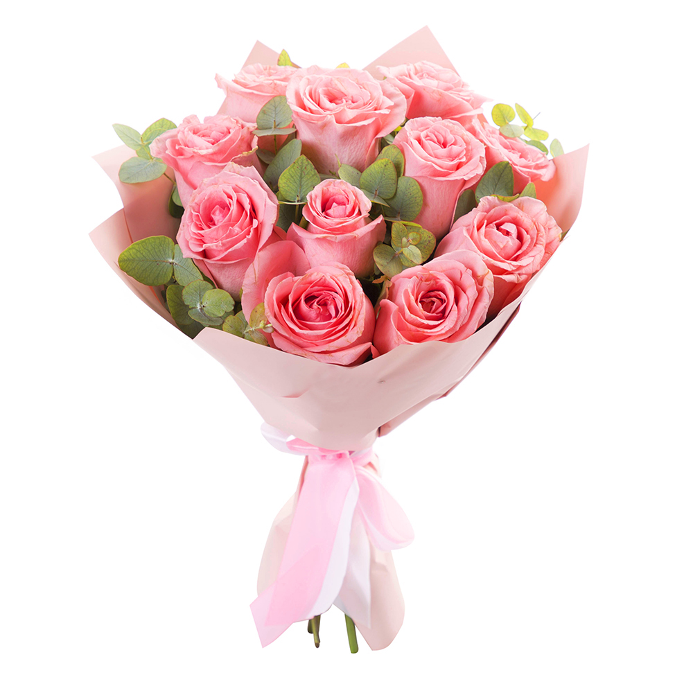 Букет из 11 розовых роз с эвкалиптом