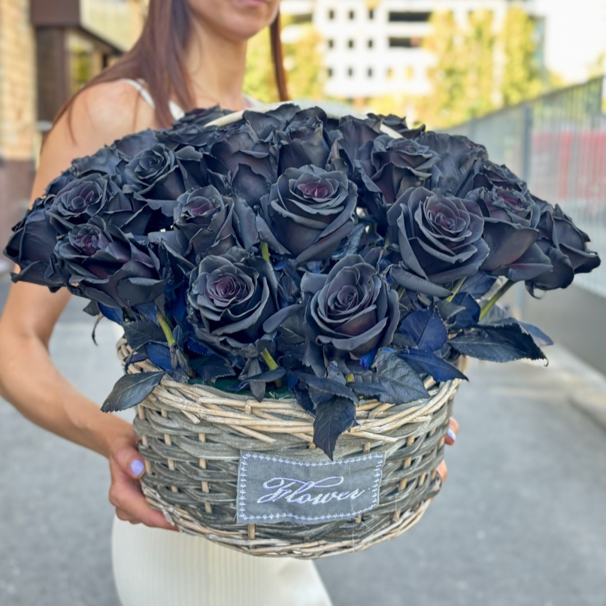 51 черная роза в корзине