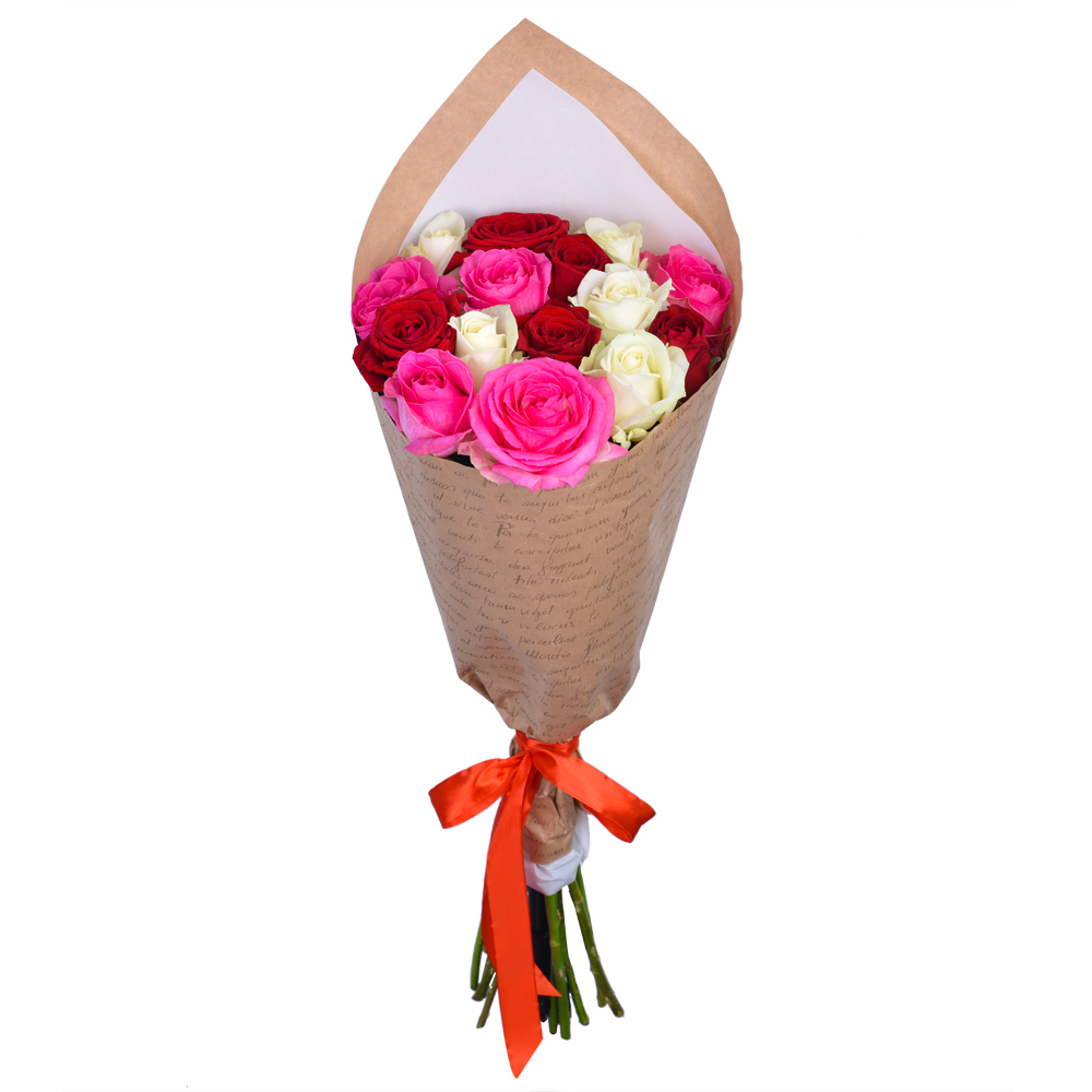 15 разноцветных роз 60 см в крафте