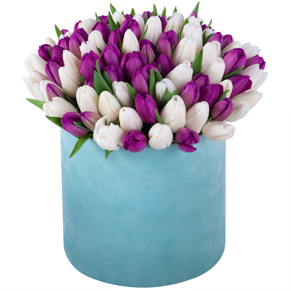 101 разноцветный тюльпан в зеленой бархатной коробке шляпной коробке