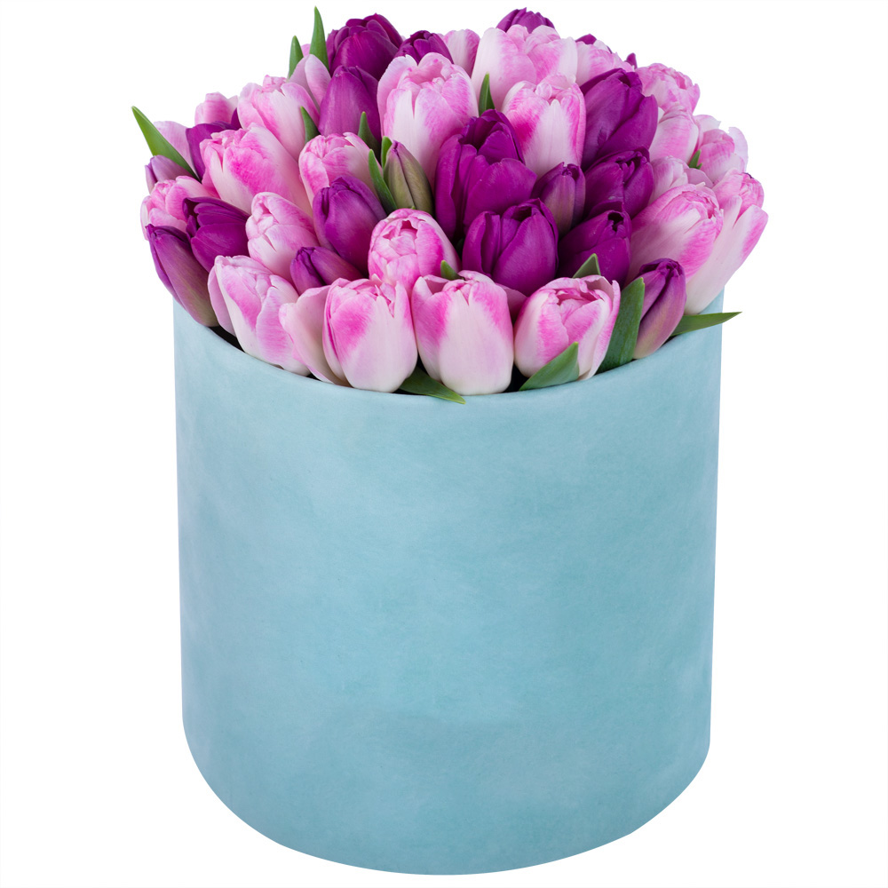 Разноцветный 51 тюльпан в зеленой бархатной шляпной коробке