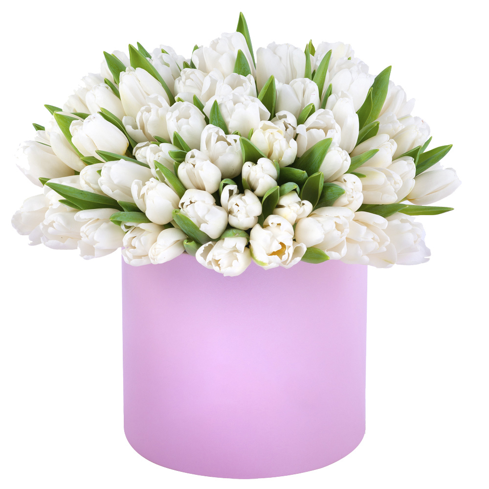 101 белый тюльпан в розовой шляпной коробке