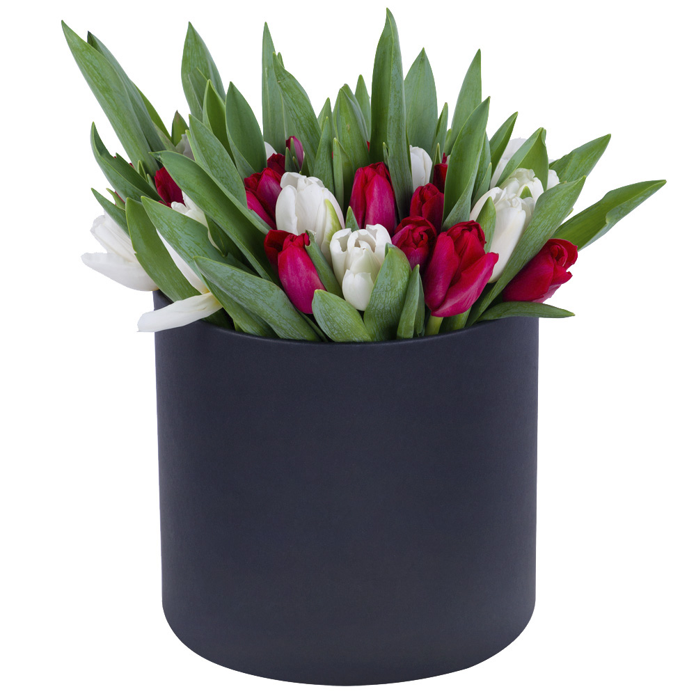 51 Разноцветный тюльпан в черной шляпной коробке