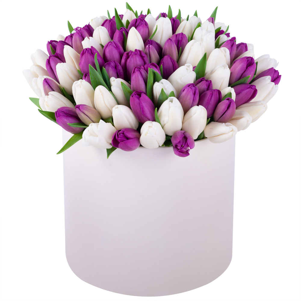 101 разноцветный тюльпан в кремовой шляпной коробке
