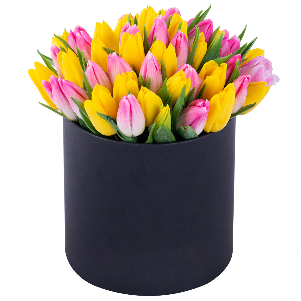 51 разноцветных тюльпан в черной шляпной коробке