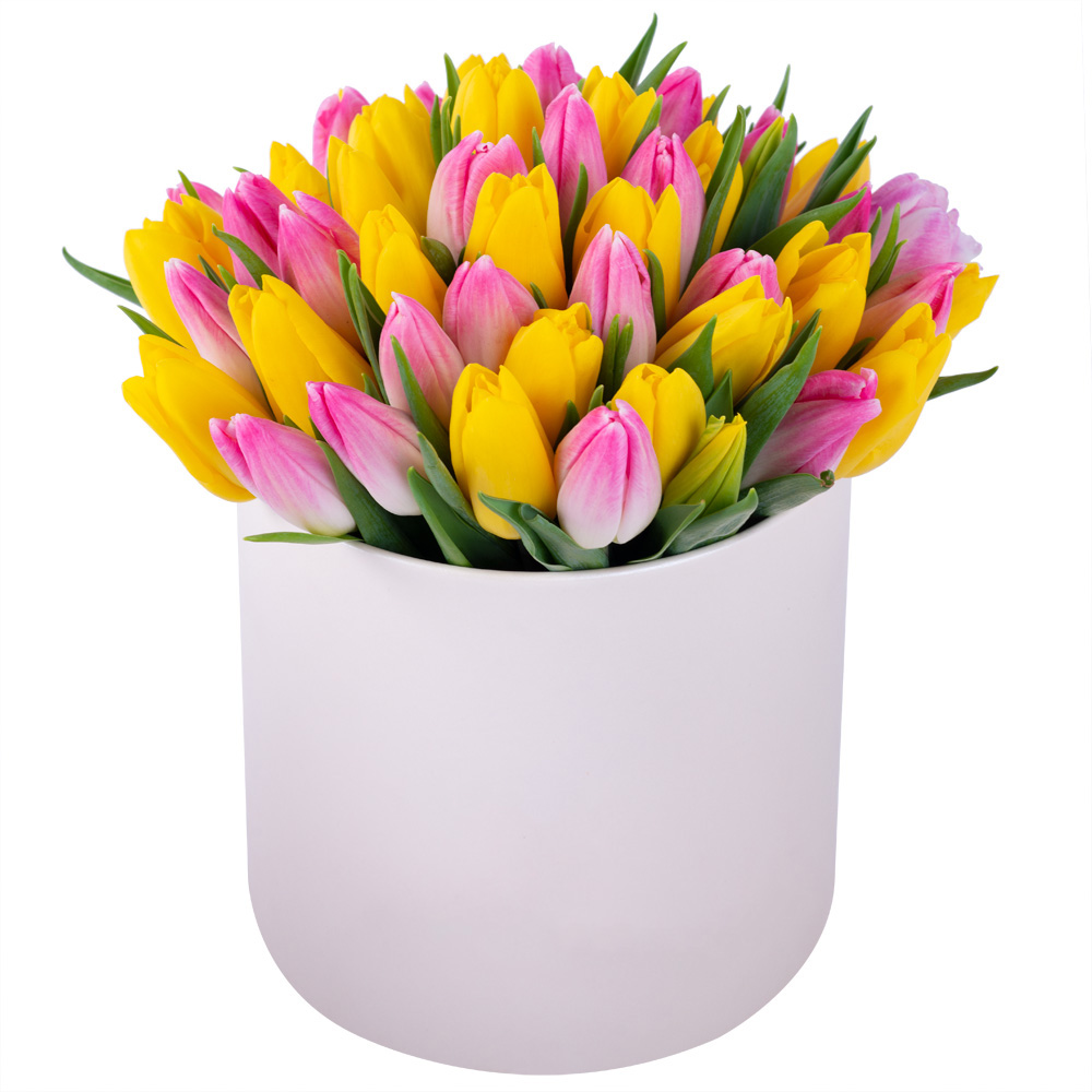 51 разноцветных тюльпан в кремовой шляпной коробке