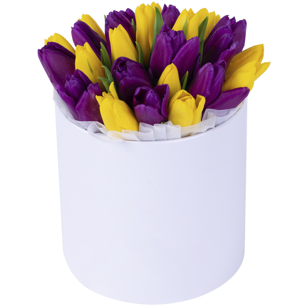 25 разноцветных тюльпан в белой шляпной коробке