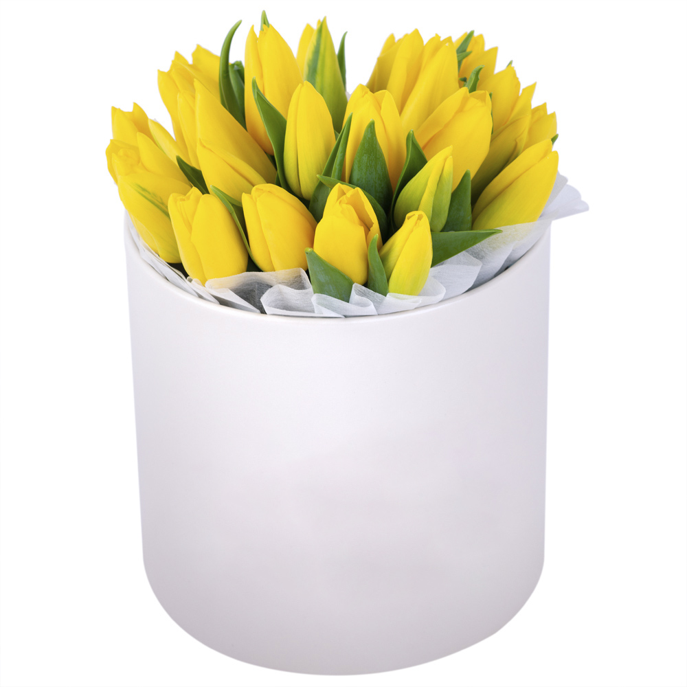 25 желтых тюльпан в кремовой шляпной коробке